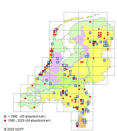 Het aantal atlasblokken (5x5 km) waarin de soort is gemeld binnen een periode van vijf jaar (vanaf 1980) of twintig jaar. Niet gecorrigeerd voor waarnemersinspanning en het aantal doorgegeven waarnemingen kan sterk variëren per periode, dus een trend in verspreiding kan hier niet direct uit worden afgelezen. Het opgegeven jaartal is het eerste jaar van de periode. Bron: gevalideerde waarnemingen uit de NDFF.
