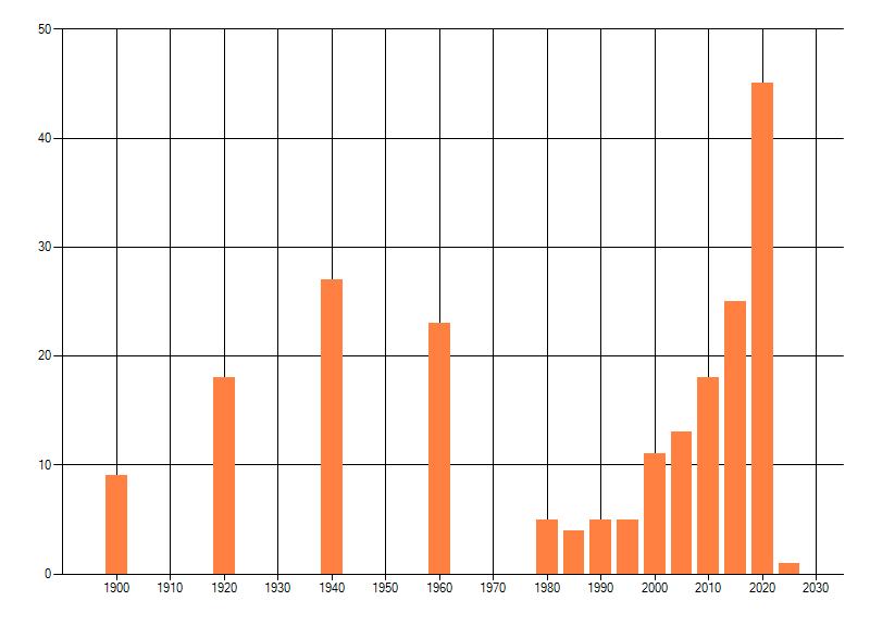 Het aantal atlasblokken (5x5 km) waarin de soort is gemeld binnen een periode van vijf jaar (vanaf 1980) of twintig jaar. Niet gecorrigeerd voor waarnemersinspanning en het aantal doorgegeven waarnemingen kan sterk variëren per periode, dus een trend in verspreiding kan hier niet direct uit worden afgelezen. Het opgegeven jaartal is het eerste jaar van de periode. Bron: gevalideerde waarnemingen uit de NDFF.