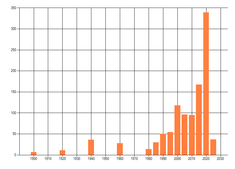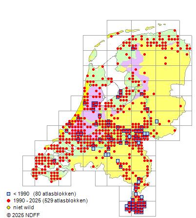Het aantal atlasblokken (5x5 km) waarin de soort is gemeld binnen een periode van vijf jaar (vanaf 1980) of twintig jaar. Niet gecorrigeerd voor waarnemersinspanning en het aantal doorgegeven waarnemingen kan sterk variëren per periode, dus een trend in verspreiding kan hier niet direct uit worden afgelezen. Het opgegeven jaartal is het eerste jaar van de periode. Bron: gevalideerde waarnemingen uit de NDFF.