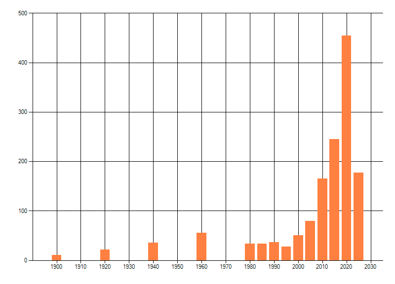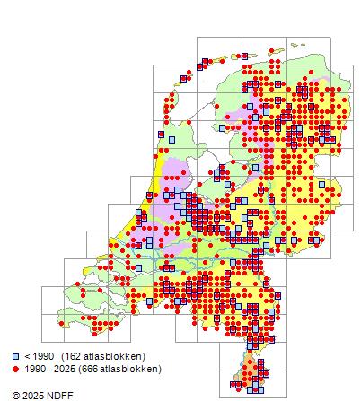 Het aantal atlasblokken (5x5 km) waarin de soort is gemeld binnen een periode van vijf jaar (vanaf 1980) of twintig jaar. Niet gecorrigeerd voor waarnemersinspanning en het aantal doorgegeven waarnemingen kan sterk variëren per periode, dus een trend in verspreiding kan hier niet direct uit worden afgelezen. Het opgegeven jaartal is het eerste jaar van de periode. Bron: gevalideerde waarnemingen uit de NDFF.