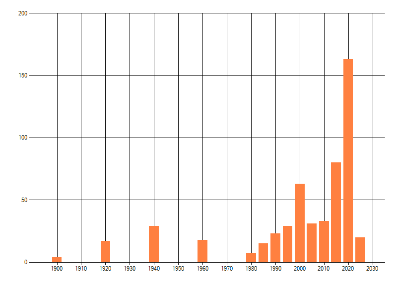 Het aantal atlasblokken (5x5 km) waarin de soort is gemeld binnen een periode van vijf jaar (vanaf 1980) of twintig jaar. Niet gecorrigeerd voor waarnemersinspanning en het aantal doorgegeven waarnemingen kan sterk variëren per periode, dus een trend in verspreiding kan hier niet direct uit worden afgelezen. Het opgegeven jaartal is het eerste jaar van de periode. Bron: gevalideerde waarnemingen uit de NDFF.