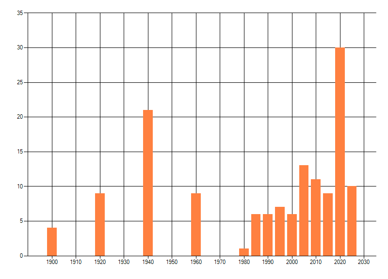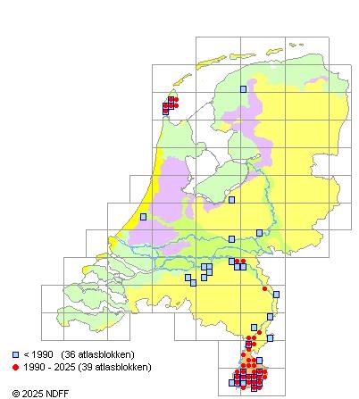 Het aantal atlasblokken (5x5 km) waarin de soort is gemeld binnen een periode van vijf jaar (vanaf 1980) of twintig jaar. Niet gecorrigeerd voor waarnemersinspanning en het aantal doorgegeven waarnemingen kan sterk variëren per periode, dus een trend in verspreiding kan hier niet direct uit worden afgelezen. Het opgegeven jaartal is het eerste jaar van de periode. Bron: gevalideerde waarnemingen uit de NDFF.