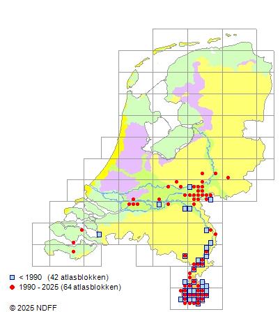 Het aantal atlasblokken (5x5 km) waarin de soort is gemeld binnen een periode van vijf jaar (vanaf 1980) of twintig jaar. Niet gecorrigeerd voor waarnemersinspanning en het aantal doorgegeven waarnemingen kan sterk variëren per periode, dus een trend in verspreiding kan hier niet direct uit worden afgelezen. Het opgegeven jaartal is het eerste jaar van de periode. Bron: gevalideerde waarnemingen uit de NDFF.