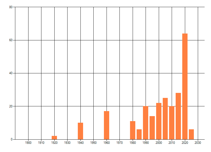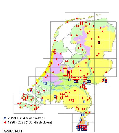 Het aantal atlasblokken (5x5 km) waarin de soort is gemeld binnen een periode van vijf jaar (vanaf 1980) of twintig jaar. Niet gecorrigeerd voor waarnemersinspanning en het aantal doorgegeven waarnemingen kan sterk variëren per periode, dus een trend in verspreiding kan hier niet direct uit worden afgelezen. Het opgegeven jaartal is het eerste jaar van de periode. Bron: gevalideerde waarnemingen uit de NDFF.