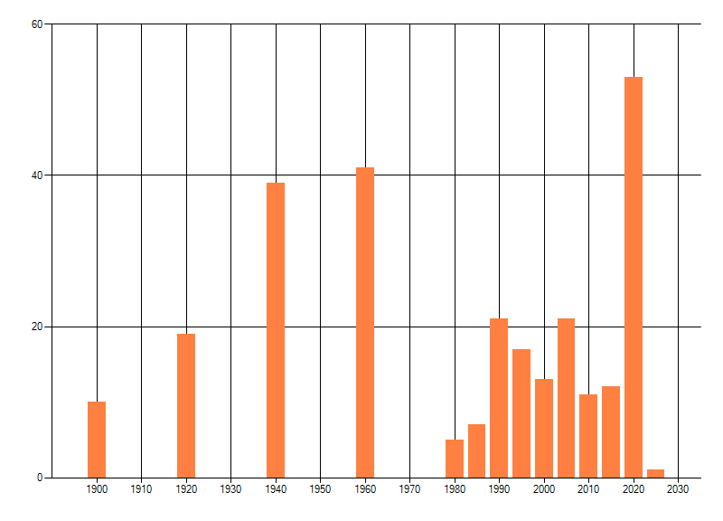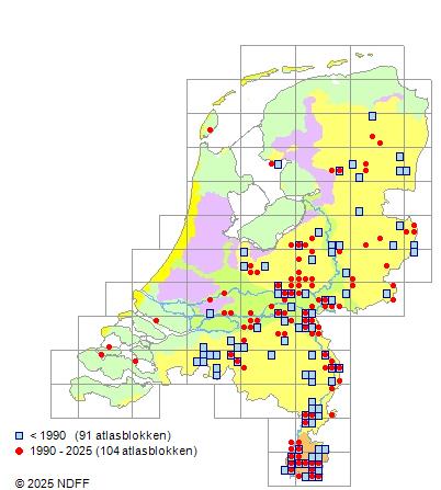 Het aantal atlasblokken (5x5 km) waarin de soort is gemeld binnen een periode van vijf jaar (vanaf 1980) of twintig jaar. Niet gecorrigeerd voor waarnemersinspanning en het aantal doorgegeven waarnemingen kan sterk variëren per periode, dus een trend in verspreiding kan hier niet direct uit worden afgelezen. Het opgegeven jaartal is het eerste jaar van de periode. Bron: gevalideerde waarnemingen uit de NDFF.