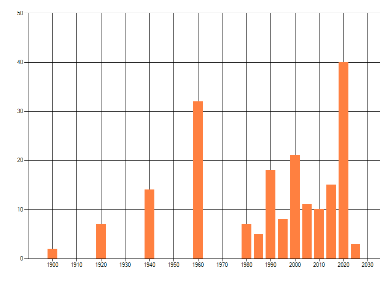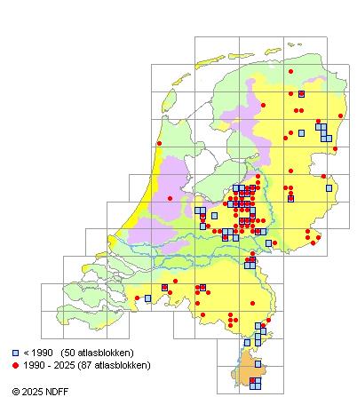 Het aantal atlasblokken (5x5 km) waarin de soort is gemeld binnen een periode van vijf jaar (vanaf 1980) of twintig jaar. Niet gecorrigeerd voor waarnemersinspanning en het aantal doorgegeven waarnemingen kan sterk variëren per periode, dus een trend in verspreiding kan hier niet direct uit worden afgelezen. Het opgegeven jaartal is het eerste jaar van de periode. Bron: gevalideerde waarnemingen uit de NDFF.