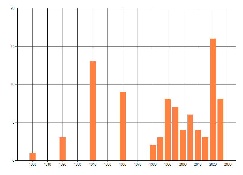 Het aantal atlasblokken (5x5 km) waarin de soort is gemeld binnen een periode van vijf jaar (vanaf 1980) of twintig jaar. Niet gecorrigeerd voor waarnemersinspanning en het aantal doorgegeven waarnemingen kan sterk variëren per periode, dus een trend in verspreiding kan hier niet direct uit worden afgelezen. Het opgegeven jaartal is het eerste jaar van de periode. Bron: gevalideerde waarnemingen uit de NDFF.
