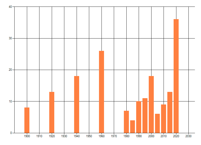 Het aantal atlasblokken (5x5 km) waarin de soort is gemeld binnen een periode van vijf jaar (vanaf 1980) of twintig jaar. Niet gecorrigeerd voor waarnemersinspanning en het aantal doorgegeven waarnemingen kan sterk variëren per periode, dus een trend in verspreiding kan hier niet direct uit worden afgelezen. Het opgegeven jaartal is het eerste jaar van de periode. Bron: gevalideerde waarnemingen uit de NDFF.