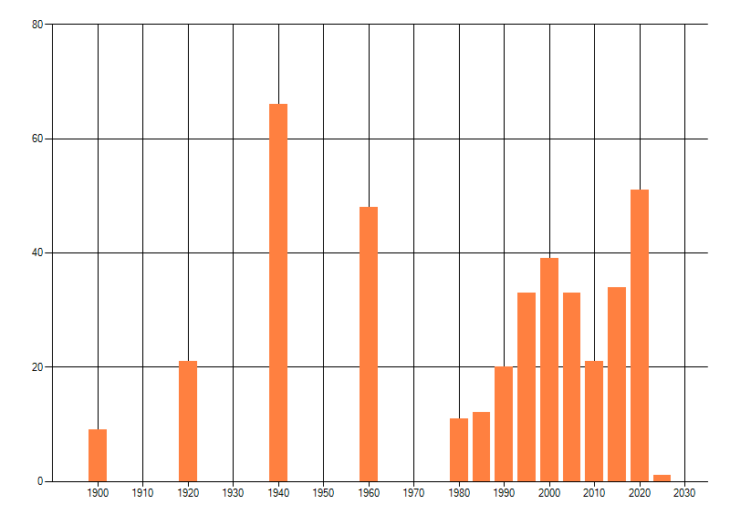 Het aantal atlasblokken (5x5 km) waarin de soort is gemeld binnen een periode van vijf jaar (vanaf 1980) of twintig jaar. Niet gecorrigeerd voor waarnemersinspanning en het aantal doorgegeven waarnemingen kan sterk variëren per periode, dus een trend in verspreiding kan hier niet direct uit worden afgelezen. Het opgegeven jaartal is het eerste jaar van de periode. Bron: gevalideerde waarnemingen uit de NDFF.