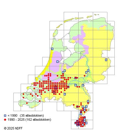 Het aantal atlasblokken (5x5 km) waarin de soort is gemeld binnen een periode van vijf jaar (vanaf 1980) of twintig jaar. Niet gecorrigeerd voor waarnemersinspanning en het aantal doorgegeven waarnemingen kan sterk variëren per periode, dus een trend in verspreiding kan hier niet direct uit worden afgelezen. Het opgegeven jaartal is het eerste jaar van de periode. Bron: gevalideerde waarnemingen uit de NDFF.