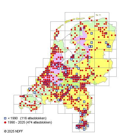 Het aantal atlasblokken (5x5 km) waarin de soort is gemeld binnen een periode van vijf jaar (vanaf 1980) of twintig jaar. Niet gecorrigeerd voor waarnemersinspanning en het aantal doorgegeven waarnemingen kan sterk variëren per periode, dus een trend in verspreiding kan hier niet direct uit worden afgelezen. Het opgegeven jaartal is het eerste jaar van de periode. Bron: gevalideerde waarnemingen uit de NDFF.