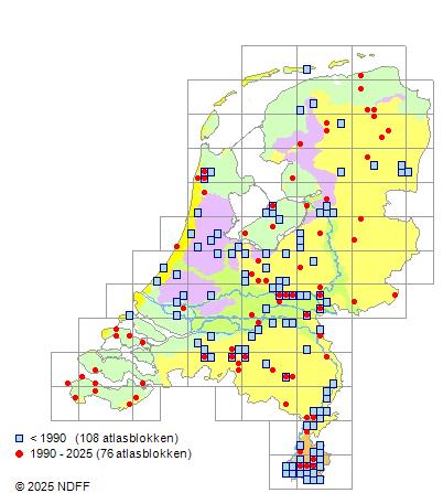 Het aantal atlasblokken (5x5 km) waarin de soort is gemeld binnen een periode van vijf jaar (vanaf 1980) of twintig jaar. Niet gecorrigeerd voor waarnemersinspanning en het aantal doorgegeven waarnemingen kan sterk variëren per periode, dus een trend in verspreiding kan hier niet direct uit worden afgelezen. Het opgegeven jaartal is het eerste jaar van de periode. Bron: gevalideerde waarnemingen uit de NDFF.