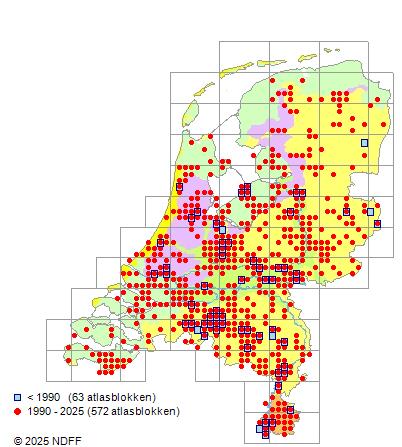 Het aantal atlasblokken (5x5 km) waarin de soort is gemeld binnen een periode van vijf jaar (vanaf 1980) of twintig jaar. Niet gecorrigeerd voor waarnemersinspanning en het aantal doorgegeven waarnemingen kan sterk variëren per periode, dus een trend in verspreiding kan hier niet direct uit worden afgelezen. Het opgegeven jaartal is het eerste jaar van de periode. Bron: gevalideerde waarnemingen uit de NDFF.