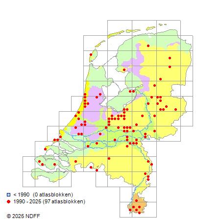 Het aantal atlasblokken (5x5 km) waarin de soort is gemeld binnen een periode van vijf jaar (vanaf 1980) of twintig jaar. Niet gecorrigeerd voor waarnemersinspanning en het aantal doorgegeven waarnemingen kan sterk variëren per periode, dus een trend in verspreiding kan hier niet direct uit worden afgelezen. Het opgegeven jaartal is het eerste jaar van de periode. Bron: gevalideerde waarnemingen uit de NDFF.