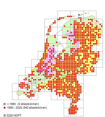 Het aantal atlasblokken (5x5 km) waarin de soort is gemeld binnen een periode van vijf jaar (vanaf 1980) of twintig jaar. Niet gecorrigeerd voor waarnemersinspanning en het aantal doorgegeven waarnemingen kan sterk variëren per periode, dus een trend in verspreiding kan hier niet direct uit worden afgelezen. Het opgegeven jaartal is het eerste jaar van de periode. Bron: gevalideerde waarnemingen uit de NDFF.