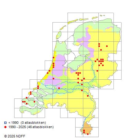 Het aantal atlasblokken (5x5 km) waarin de soort is gemeld binnen een periode van vijf jaar (vanaf 1980) of twintig jaar. Niet gecorrigeerd voor waarnemersinspanning en het aantal doorgegeven waarnemingen kan sterk variëren per periode, dus een trend in verspreiding kan hier niet direct uit worden afgelezen. Het opgegeven jaartal is het eerste jaar van de periode. Bron: gevalideerde waarnemingen uit de NDFF.