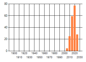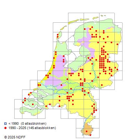 Het aantal atlasblokken (5x5 km) waarin de soort is gemeld binnen een periode van vijf jaar (vanaf 1980) of twintig jaar. Niet gecorrigeerd voor waarnemersinspanning en het aantal doorgegeven waarnemingen kan sterk variëren per periode, dus een trend in verspreiding kan hier niet direct uit worden afgelezen. Het opgegeven jaartal is het eerste jaar van de periode. Bron: gevalideerde waarnemingen uit de NDFF.