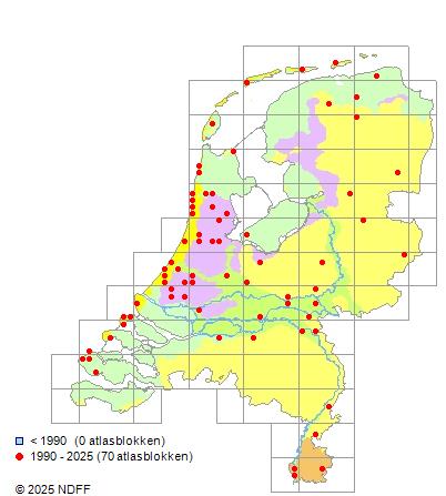 Het aantal atlasblokken (5x5 km) waarin de soort is gemeld binnen een periode van vijf jaar (vanaf 1980) of twintig jaar. Niet gecorrigeerd voor waarnemersinspanning en het aantal doorgegeven waarnemingen kan sterk variëren per periode, dus een trend in verspreiding kan hier niet direct uit worden afgelezen. Het opgegeven jaartal is het eerste jaar van de periode. Bron: gevalideerde waarnemingen uit de NDFF.