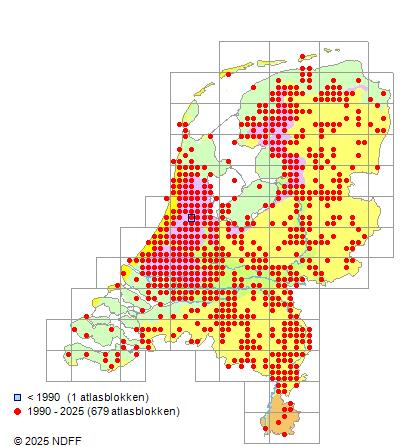 Het aantal atlasblokken (5x5 km) waarin de soort is gemeld binnen een periode van vijf jaar (vanaf 1980) of twintig jaar. Niet gecorrigeerd voor waarnemersinspanning en het aantal doorgegeven waarnemingen kan sterk variëren per periode, dus een trend in verspreiding kan hier niet direct uit worden afgelezen. Het opgegeven jaartal is het eerste jaar van de periode. Bron: gevalideerde waarnemingen uit de NDFF.