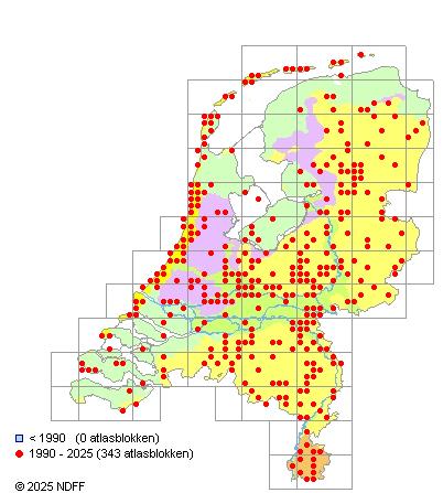 Het aantal atlasblokken (5x5 km) waarin de soort is gemeld binnen een periode van vijf jaar (vanaf 1980) of twintig jaar. Niet gecorrigeerd voor waarnemersinspanning en het aantal doorgegeven waarnemingen kan sterk variëren per periode, dus een trend in verspreiding kan hier niet direct uit worden afgelezen. Het opgegeven jaartal is het eerste jaar van de periode. Bron: gevalideerde waarnemingen uit de NDFF.