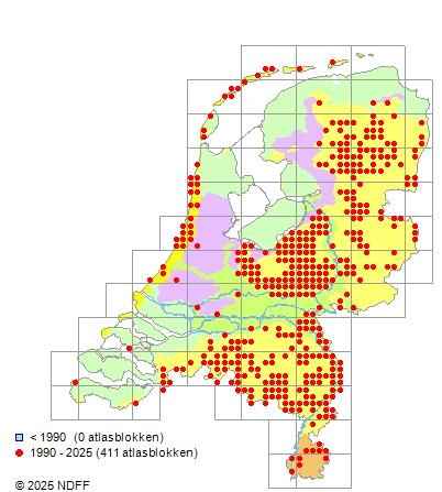 Het aantal atlasblokken (5x5 km) waarin de soort is gemeld binnen een periode van vijf jaar (vanaf 1980) of twintig jaar. Niet gecorrigeerd voor waarnemersinspanning en het aantal doorgegeven waarnemingen kan sterk variëren per periode, dus een trend in verspreiding kan hier niet direct uit worden afgelezen. Het opgegeven jaartal is het eerste jaar van de periode. Bron: gevalideerde waarnemingen uit de NDFF.