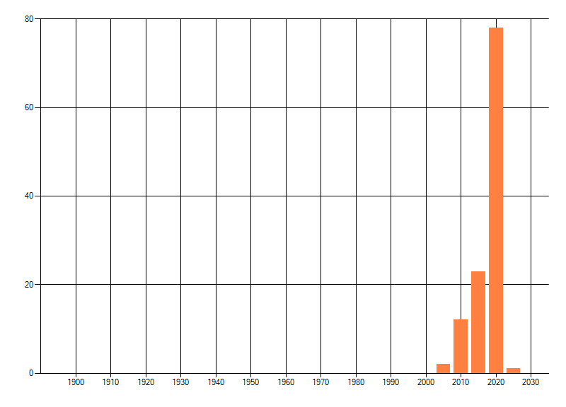 Het aantal atlasblokken (5x5 km) waarin de soort is gemeld binnen een periode van vijf jaar (vanaf 1980) of twintig jaar. Niet gecorrigeerd voor waarnemersinspanning en het aantal doorgegeven waarnemingen kan sterk variëren per periode, dus een trend in verspreiding kan hier niet direct uit worden afgelezen. Het opgegeven jaartal is het eerste jaar van de periode. Bron: gevalideerde waarnemingen uit de NDFF.