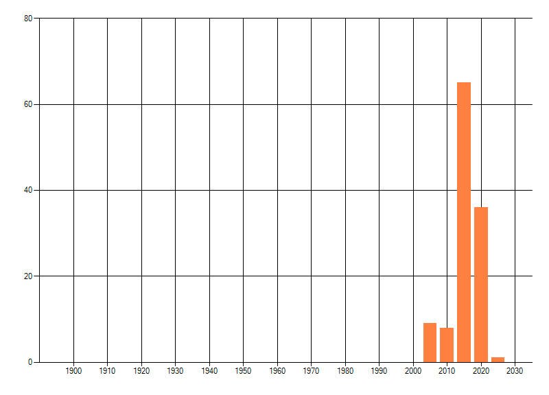 Het aantal atlasblokken (5x5 km) waarin de soort is gemeld binnen een periode van vijf jaar (vanaf 1980) of twintig jaar. Niet gecorrigeerd voor waarnemersinspanning en het aantal doorgegeven waarnemingen kan sterk variëren per periode, dus een trend in verspreiding kan hier niet direct uit worden afgelezen. Het opgegeven jaartal is het eerste jaar van de periode. Bron: gevalideerde waarnemingen uit de NDFF.