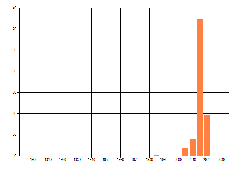 Het aantal atlasblokken (5x5 km) waarin de soort is gemeld binnen een periode van vijf jaar (vanaf 1980) of twintig jaar. Niet gecorrigeerd voor waarnemersinspanning en het aantal doorgegeven waarnemingen kan sterk variëren per periode, dus een trend in verspreiding kan hier niet direct uit worden afgelezen. Het opgegeven jaartal is het eerste jaar van de periode. Bron: gevalideerde waarnemingen uit de NDFF.