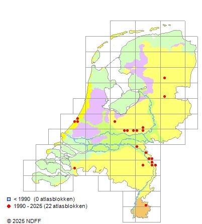 Het aantal atlasblokken (5x5 km) waarin de soort is gemeld binnen een periode van vijf jaar (vanaf 1980) of twintig jaar. Niet gecorrigeerd voor waarnemersinspanning en het aantal doorgegeven waarnemingen kan sterk variëren per periode, dus een trend in verspreiding kan hier niet direct uit worden afgelezen. Het opgegeven jaartal is het eerste jaar van de periode. Bron: gevalideerde waarnemingen uit de NDFF.