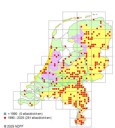 Het aantal atlasblokken (5x5 km) waarin de soort is gemeld binnen een periode van vijf jaar (vanaf 1980) of twintig jaar. Niet gecorrigeerd voor waarnemersinspanning en het aantal doorgegeven waarnemingen kan sterk variëren per periode, dus een trend in verspreiding kan hier niet direct uit worden afgelezen. Het opgegeven jaartal is het eerste jaar van de periode. Bron: gevalideerde waarnemingen uit de NDFF.