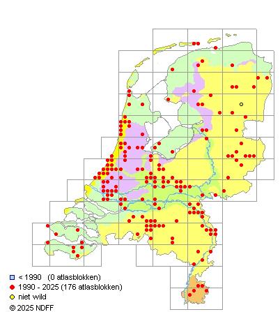 Het aantal atlasblokken (5x5 km) waarin de soort is gemeld binnen een periode van vijf jaar (vanaf 1980) of twintig jaar. Niet gecorrigeerd voor waarnemersinspanning en het aantal doorgegeven waarnemingen kan sterk variëren per periode, dus een trend in verspreiding kan hier niet direct uit worden afgelezen. Het opgegeven jaartal is het eerste jaar van de periode. Bron: gevalideerde waarnemingen uit de NDFF.