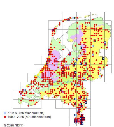Het aantal atlasblokken (5x5 km) waarin de soort is gemeld binnen een periode van vijf jaar (vanaf 1980) of twintig jaar. Niet gecorrigeerd voor waarnemersinspanning en het aantal doorgegeven waarnemingen kan sterk variëren per periode, dus een trend in verspreiding kan hier niet direct uit worden afgelezen. Het opgegeven jaartal is het eerste jaar van de periode. Bron: gevalideerde waarnemingen uit de NDFF.