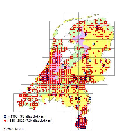 Het aantal atlasblokken (5x5 km) waarin de soort is gemeld binnen een periode van vijf jaar (vanaf 1980) of twintig jaar. Niet gecorrigeerd voor waarnemersinspanning en het aantal doorgegeven waarnemingen kan sterk variëren per periode, dus een trend in verspreiding kan hier niet direct uit worden afgelezen. Het opgegeven jaartal is het eerste jaar van de periode. Bron: gevalideerde waarnemingen uit de NDFF.