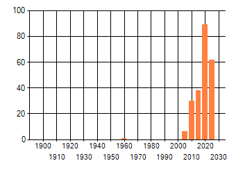 Het aantal atlasblokken (5x5 km) waarin de soort is gemeld binnen een periode van vijf jaar (vanaf 1980) of twintig jaar. Niet gecorrigeerd voor waarnemersinspanning en het aantal doorgegeven waarnemingen kan sterk variëren per periode, dus een trend in verspreiding kan hier niet direct uit worden afgelezen. Het opgegeven jaartal is het eerste jaar van de periode. Bron: gevalideerde waarnemingen uit de NDFF.