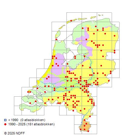 Het aantal atlasblokken (5x5 km) waarin de soort is gemeld binnen een periode van vijf jaar (vanaf 1980) of twintig jaar. Niet gecorrigeerd voor waarnemersinspanning en het aantal doorgegeven waarnemingen kan sterk variëren per periode, dus een trend in verspreiding kan hier niet direct uit worden afgelezen. Het opgegeven jaartal is het eerste jaar van de periode. Bron: gevalideerde waarnemingen uit de NDFF.