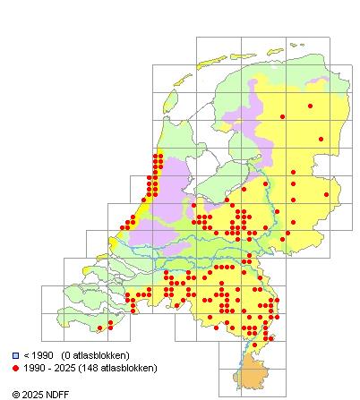 Het aantal atlasblokken (5x5 km) waarin de soort is gemeld binnen een periode van vijf jaar (vanaf 1980) of twintig jaar. Niet gecorrigeerd voor waarnemersinspanning en het aantal doorgegeven waarnemingen kan sterk variëren per periode, dus een trend in verspreiding kan hier niet direct uit worden afgelezen. Het opgegeven jaartal is het eerste jaar van de periode. Bron: gevalideerde waarnemingen uit de NDFF.