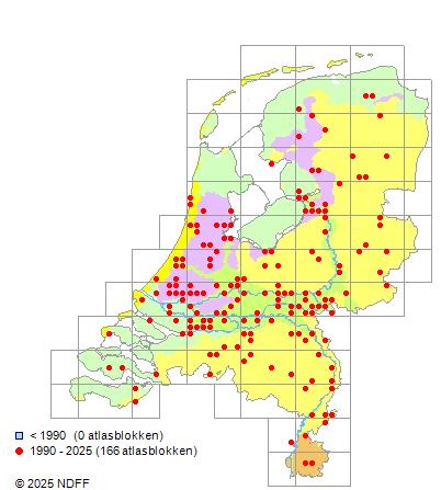 Het aantal atlasblokken (5x5 km) waarin de soort is gemeld binnen een periode van vijf jaar (vanaf 1980) of twintig jaar. Niet gecorrigeerd voor waarnemersinspanning en het aantal doorgegeven waarnemingen kan sterk variëren per periode, dus een trend in verspreiding kan hier niet direct uit worden afgelezen. Het opgegeven jaartal is het eerste jaar van de periode. Bron: gevalideerde waarnemingen uit de NDFF.