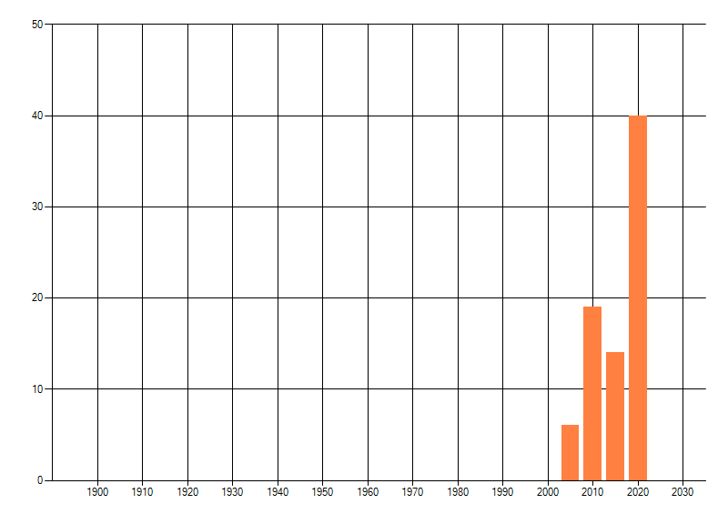Het aantal atlasblokken (5x5 km) waarin de soort is gemeld binnen een periode van vijf jaar (vanaf 1980) of twintig jaar. Niet gecorrigeerd voor waarnemersinspanning en het aantal doorgegeven waarnemingen kan sterk variëren per periode, dus een trend in verspreiding kan hier niet direct uit worden afgelezen. Het opgegeven jaartal is het eerste jaar van de periode. Bron: gevalideerde waarnemingen uit de NDFF.