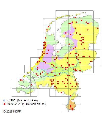 Het aantal atlasblokken (5x5 km) waarin de soort is gemeld binnen een periode van vijf jaar (vanaf 1980) of twintig jaar. Niet gecorrigeerd voor waarnemersinspanning en het aantal doorgegeven waarnemingen kan sterk variëren per periode, dus een trend in verspreiding kan hier niet direct uit worden afgelezen. Het opgegeven jaartal is het eerste jaar van de periode. Bron: gevalideerde waarnemingen uit de NDFF.