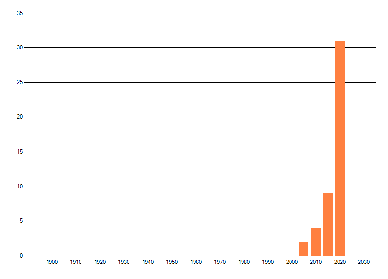 Het aantal atlasblokken (5x5 km) waarin de soort is gemeld binnen een periode van vijf jaar (vanaf 1980) of twintig jaar. Niet gecorrigeerd voor waarnemersinspanning en het aantal doorgegeven waarnemingen kan sterk variëren per periode, dus een trend in verspreiding kan hier niet direct uit worden afgelezen. Het opgegeven jaartal is het eerste jaar van de periode. Bron: gevalideerde waarnemingen uit de NDFF.