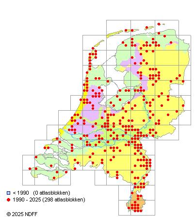 Het aantal atlasblokken (5x5 km) waarin de soort is gemeld binnen een periode van vijf jaar (vanaf 1980) of twintig jaar. Niet gecorrigeerd voor waarnemersinspanning en het aantal doorgegeven waarnemingen kan sterk variëren per periode, dus een trend in verspreiding kan hier niet direct uit worden afgelezen. Het opgegeven jaartal is het eerste jaar van de periode. Bron: gevalideerde waarnemingen uit de NDFF.