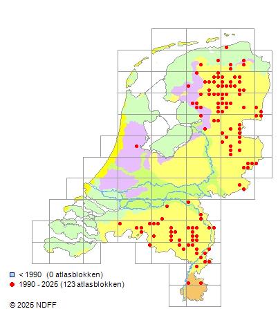 Het aantal atlasblokken (5x5 km) waarin de soort is gemeld binnen een periode van vijf jaar (vanaf 1980) of twintig jaar. Niet gecorrigeerd voor waarnemersinspanning en het aantal doorgegeven waarnemingen kan sterk variëren per periode, dus een trend in verspreiding kan hier niet direct uit worden afgelezen. Het opgegeven jaartal is het eerste jaar van de periode. Bron: gevalideerde waarnemingen uit de NDFF.