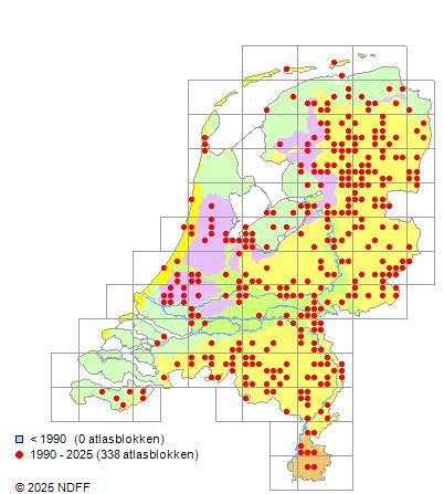 Het aantal atlasblokken (5x5 km) waarin de soort is gemeld binnen een periode van vijf jaar (vanaf 1980) of twintig jaar. Niet gecorrigeerd voor waarnemersinspanning en het aantal doorgegeven waarnemingen kan sterk variëren per periode, dus een trend in verspreiding kan hier niet direct uit worden afgelezen. Het opgegeven jaartal is het eerste jaar van de periode. Bron: gevalideerde waarnemingen uit de NDFF.