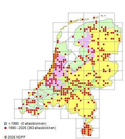 Het aantal atlasblokken (5x5 km) waarin de soort is gemeld binnen een periode van vijf jaar (vanaf 1980) of twintig jaar. Niet gecorrigeerd voor waarnemersinspanning en het aantal doorgegeven waarnemingen kan sterk variëren per periode, dus een trend in verspreiding kan hier niet direct uit worden afgelezen. Het opgegeven jaartal is het eerste jaar van de periode. Bron: gevalideerde waarnemingen uit de NDFF.
