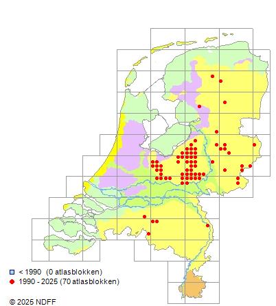 Het aantal atlasblokken (5x5 km) waarin de soort is gemeld binnen een periode van vijf jaar (vanaf 1980) of twintig jaar. Niet gecorrigeerd voor waarnemersinspanning en het aantal doorgegeven waarnemingen kan sterk variëren per periode, dus een trend in verspreiding kan hier niet direct uit worden afgelezen. Het opgegeven jaartal is het eerste jaar van de periode. Bron: gevalideerde waarnemingen uit de NDFF.
