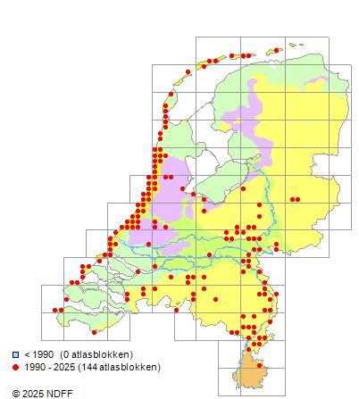 Het aantal atlasblokken (5x5 km) waarin de soort is gemeld binnen een periode van vijf jaar (vanaf 1980) of twintig jaar. Niet gecorrigeerd voor waarnemersinspanning en het aantal doorgegeven waarnemingen kan sterk variëren per periode, dus een trend in verspreiding kan hier niet direct uit worden afgelezen. Het opgegeven jaartal is het eerste jaar van de periode. Bron: gevalideerde waarnemingen uit de NDFF.