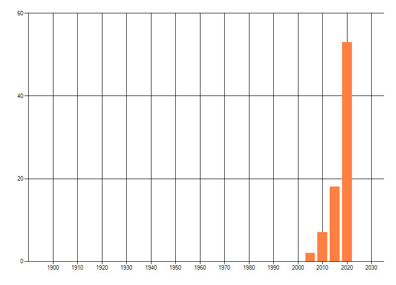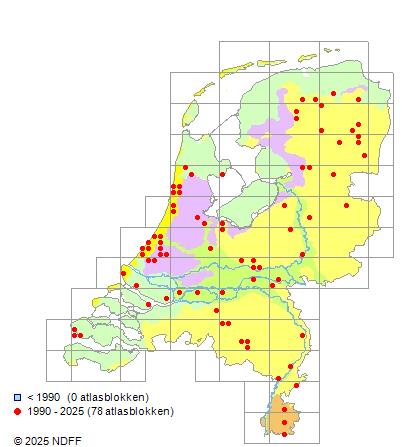 Het aantal atlasblokken (5x5 km) waarin de soort is gemeld binnen een periode van vijf jaar (vanaf 1980) of twintig jaar. Niet gecorrigeerd voor waarnemersinspanning en het aantal doorgegeven waarnemingen kan sterk variëren per periode, dus een trend in verspreiding kan hier niet direct uit worden afgelezen. Het opgegeven jaartal is het eerste jaar van de periode. Bron: gevalideerde waarnemingen uit de NDFF.