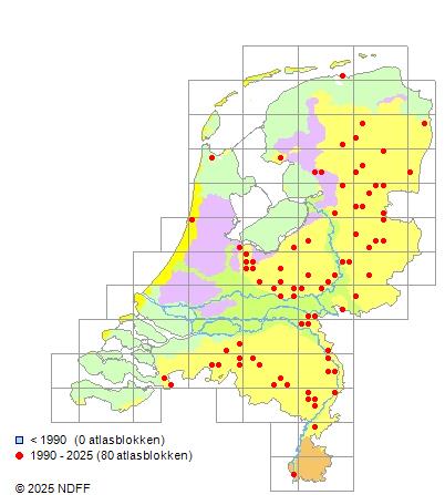 Het aantal atlasblokken (5x5 km) waarin de soort is gemeld binnen een periode van vijf jaar (vanaf 1980) of twintig jaar. Niet gecorrigeerd voor waarnemersinspanning en het aantal doorgegeven waarnemingen kan sterk variëren per periode, dus een trend in verspreiding kan hier niet direct uit worden afgelezen. Het opgegeven jaartal is het eerste jaar van de periode. Bron: gevalideerde waarnemingen uit de NDFF.