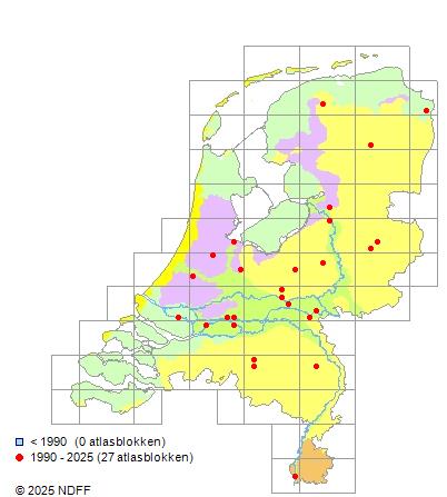 Het aantal atlasblokken (5x5 km) waarin de soort is gemeld binnen een periode van vijf jaar (vanaf 1980) of twintig jaar. Niet gecorrigeerd voor waarnemersinspanning en het aantal doorgegeven waarnemingen kan sterk variëren per periode, dus een trend in verspreiding kan hier niet direct uit worden afgelezen. Het opgegeven jaartal is het eerste jaar van de periode. Bron: gevalideerde waarnemingen uit de NDFF.