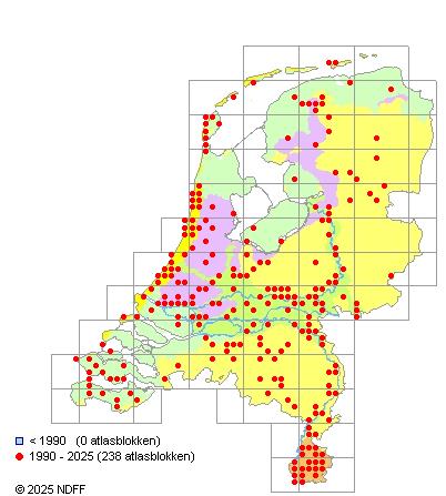 Het aantal atlasblokken (5x5 km) waarin de soort is gemeld binnen een periode van vijf jaar (vanaf 1980) of twintig jaar. Niet gecorrigeerd voor waarnemersinspanning en het aantal doorgegeven waarnemingen kan sterk variëren per periode, dus een trend in verspreiding kan hier niet direct uit worden afgelezen. Het opgegeven jaartal is het eerste jaar van de periode. Bron: gevalideerde waarnemingen uit de NDFF.